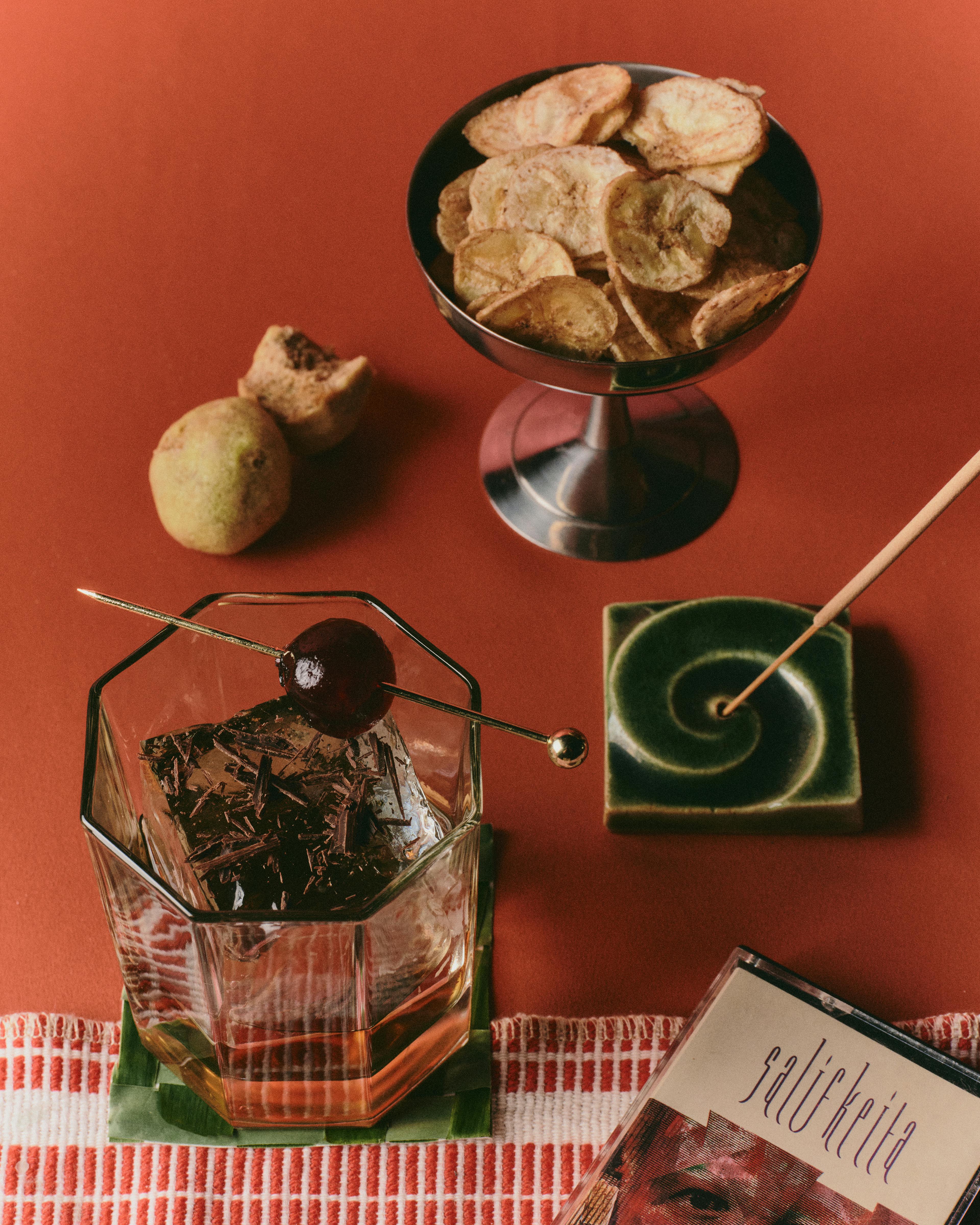 - Shave Bantu 73% dark chocolate on top and garnish with a cocktail cherry.